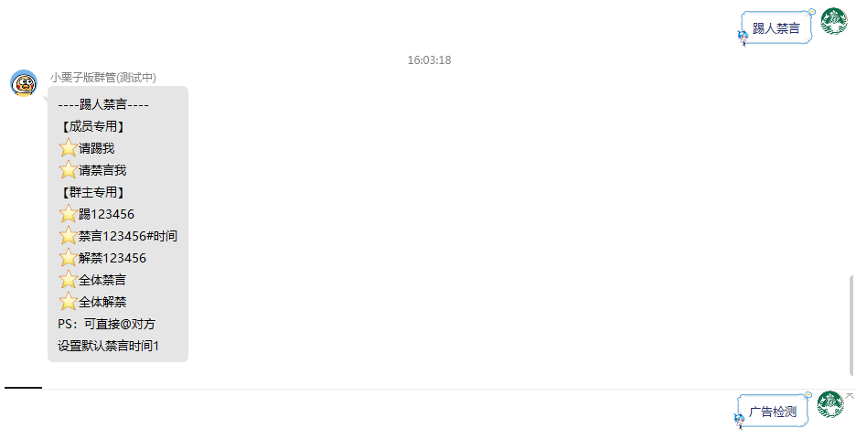 插件功能:买家秀、问答系统、黑白系统、踢人禁言、广告检测、入群审核、刷屏检测、撤回系统、护主系统、匿名系统、提示系统、名片系统、问题反馈、出租系统、远程系统、针对系统、发言排行、邀请统计、邮箱系统、特色系统、召唤系统、开关系统、娱乐系统、资料设置、定时任务、主人专属、群主专属、运行状态、站长工具、私聊指令、警告系统、基础群管、清屏系统、卡密系统、闪照系统 、头衔管理、防撤回系统